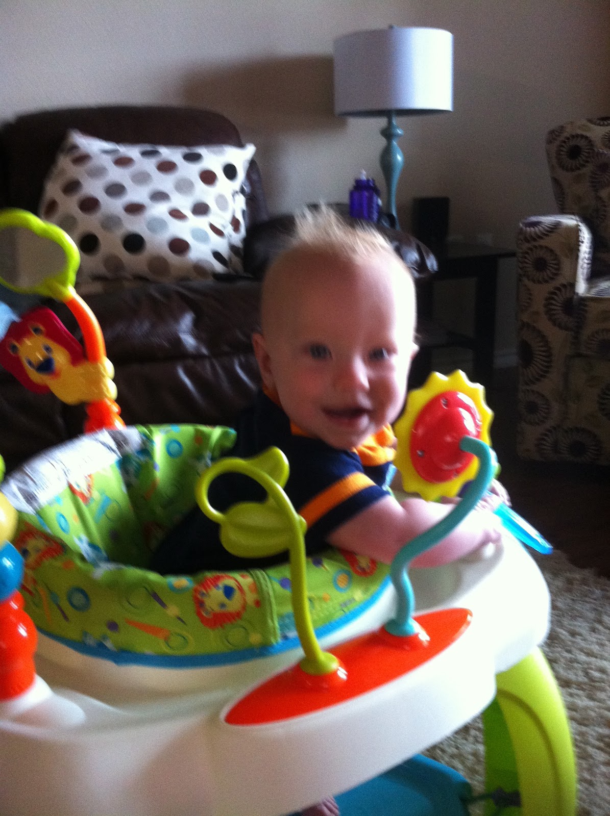 I canNOT believe you are 6 months old. It has been an incredible 6 months, but this last month has been my absolute favorite. We have had zero gas issues, you are sleeping incredibly, and you are eating like a champ! You weight 18lbs 3oz and are 26 1/2 inches long. You are now on formula and you take 2 8oz bottles a day and 2 6oz bottles, plus 3 foods. Your days are very predictable, which I love! You wake up sometime between 5 and 6 for your first 8oz bottle, then go right back to sleep. You wake up for the day between 8 and 9. You are awake for exactly 2 hours then need your first nap. During that first 2 hours, you roll around on our bed, talk, play with your feet, then you eat some sort of fruit. Your favorite for the mornings is a combination of apples and bananas. But since you have to have your cereal, I will combine your cereal with a little formula then mix it with the apples. After you eat your breakfast, we usually play in the living room. You love to sit on your own. You aren't even wobbly any more! You can bend over and pick up whatever toy you want then sit back up. You are beginning to get up on your hands knees and rocking to crawl, but for some reason instead of just crawling like that, you put your head down on the floor, then crawl. You don't go very fast, but you definitely get where you are going. If there is a toy across the floor that you want, you get to it! Your exersaucer is one of your favorite toys. I have loved watching you figure out what all the different parts do. I remember putting you in it when you were about 3 1/2 months old and you only liked being in it for about a minute at a time and didn't really play in it. Now you just spin all around to the different things. It's been so neat to see you develop and understand things more. You usually just let out a quick whine after you've been up for 2 hours and I know it's nap time. All I have to do is put your paci in, lay you down, pat your bottom and you are out. That's when I try to get my shower and whatever other little things I need to get done around the house. You sleep anywhere between an hour to 2 1/2 hours for your first nap. Once you wake up, you take a 6oz bottle, then an hour later you have some sort of veggie. You love to eat Ella's Kitchen foods because of the combination of flavors. It's funny when I switch you back to regular baby food that is just one veggie or fruit because you get bored with it very quickly! We usually try to get out sometime around 2 (for Sonic happy hour, of course!). Generally, we take a drink up to Daddy at work then run whatever other quick errands we have for the day. When we get back, you lay down for another nap. Your afternoon naps only last about 45 minutes-1 hour. You wake up in the morning and from naps just talking and blowing bubbles. I let you do that for as long as you want. The other morning you did it for 40 minutes, then I couldn't stand it any more and wanted to see you, so I went in to get you and you just looked at me with the biggest grin on your face. Once you wake up from your afternoon nap, we just play until Daddy gets home from work. Once he gets home, you eat again, we eat, then you and Daddy play together. Around 7 or so, you get your last 8oz bottle, then Daddy gives you a bath. You still love bath time. You kick, splash, and squeal the whole time. As soon as you are dry and your jammies are on, you go to bed. If you wake up in the night, it is because you have lost your paci, but you generally can find it yourself and put it back in, then fall back asleep on your own.